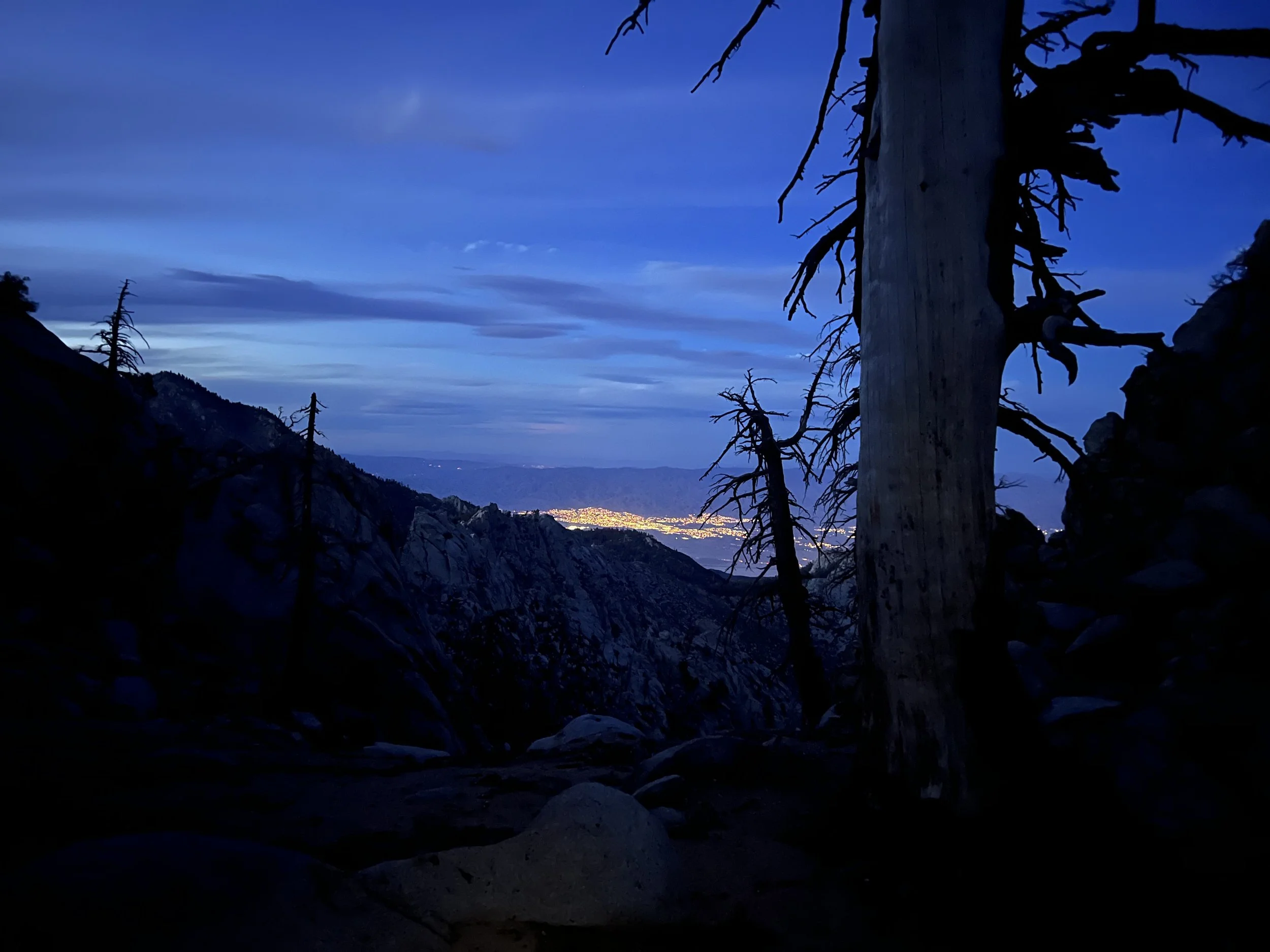 Feeling good I decided to continue another 1200’ to camp at the 175 mile mark. Those last couple of miles were slow, numerous trees had blown down across the trail and either clambering over or around them meant I didn’t get to my planned camping spot until the sun was about to set. A few others were already camped in the area but inside their tents as the wind had started to pick up. I found a sheltered spot and settled down for the night after one last look down to the lights of Palm Springs below.