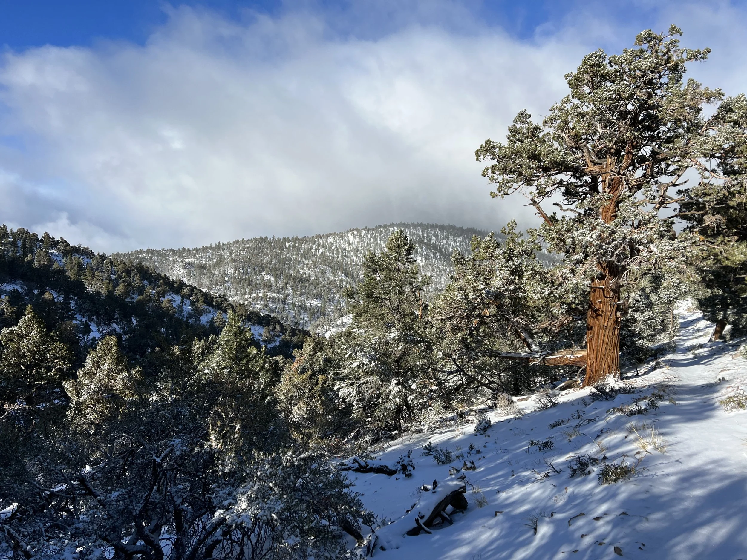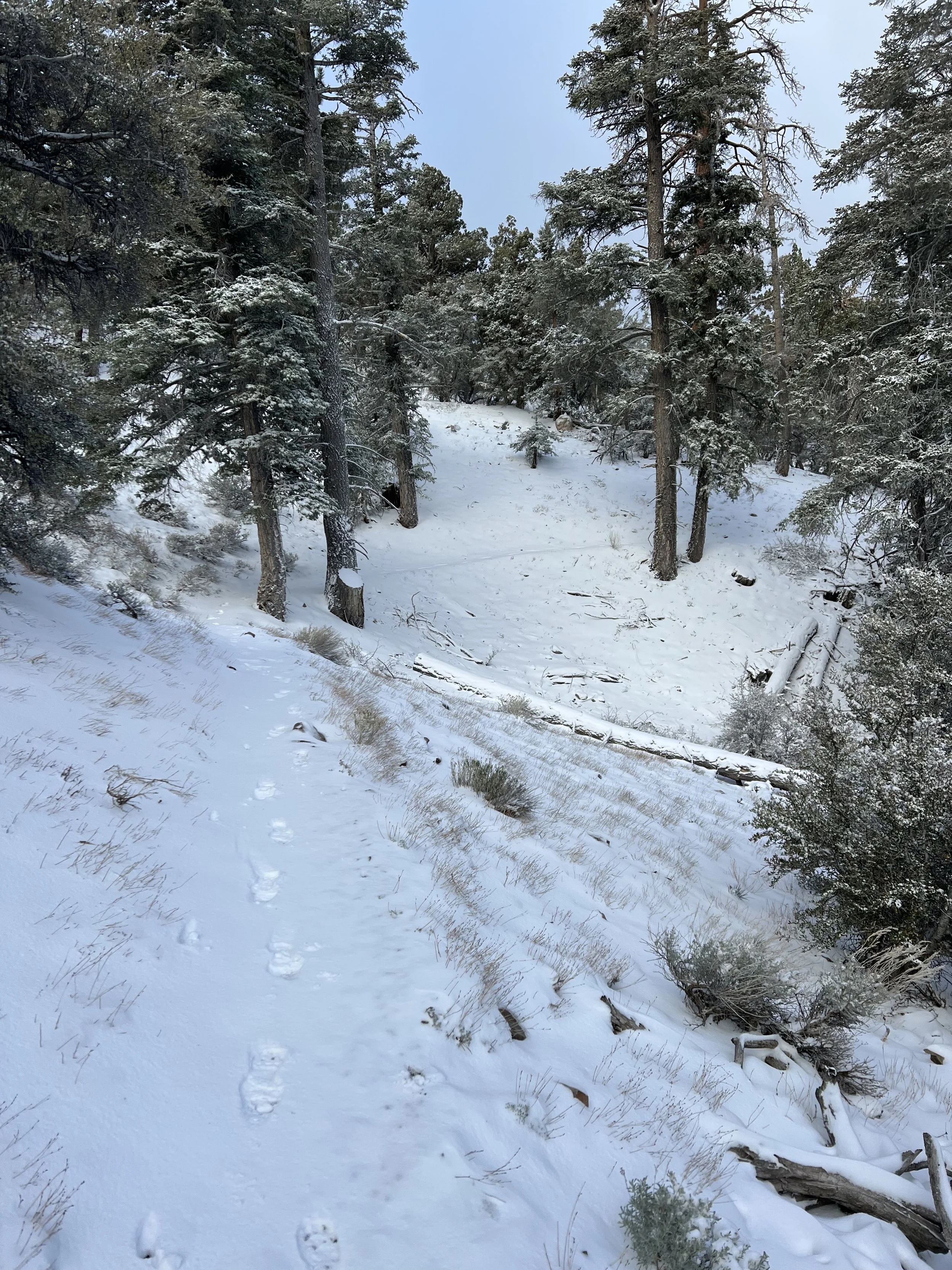 Climbing 1200’ above the source of Mission Creek led to a ridge line trail headed towards the town of Big Bear Lake. Able to check the weather forecast after regaining cell signal it was difficult to believe that the blue sky and warm temperatures were to give way to below freezing temperatures and overnight snow.