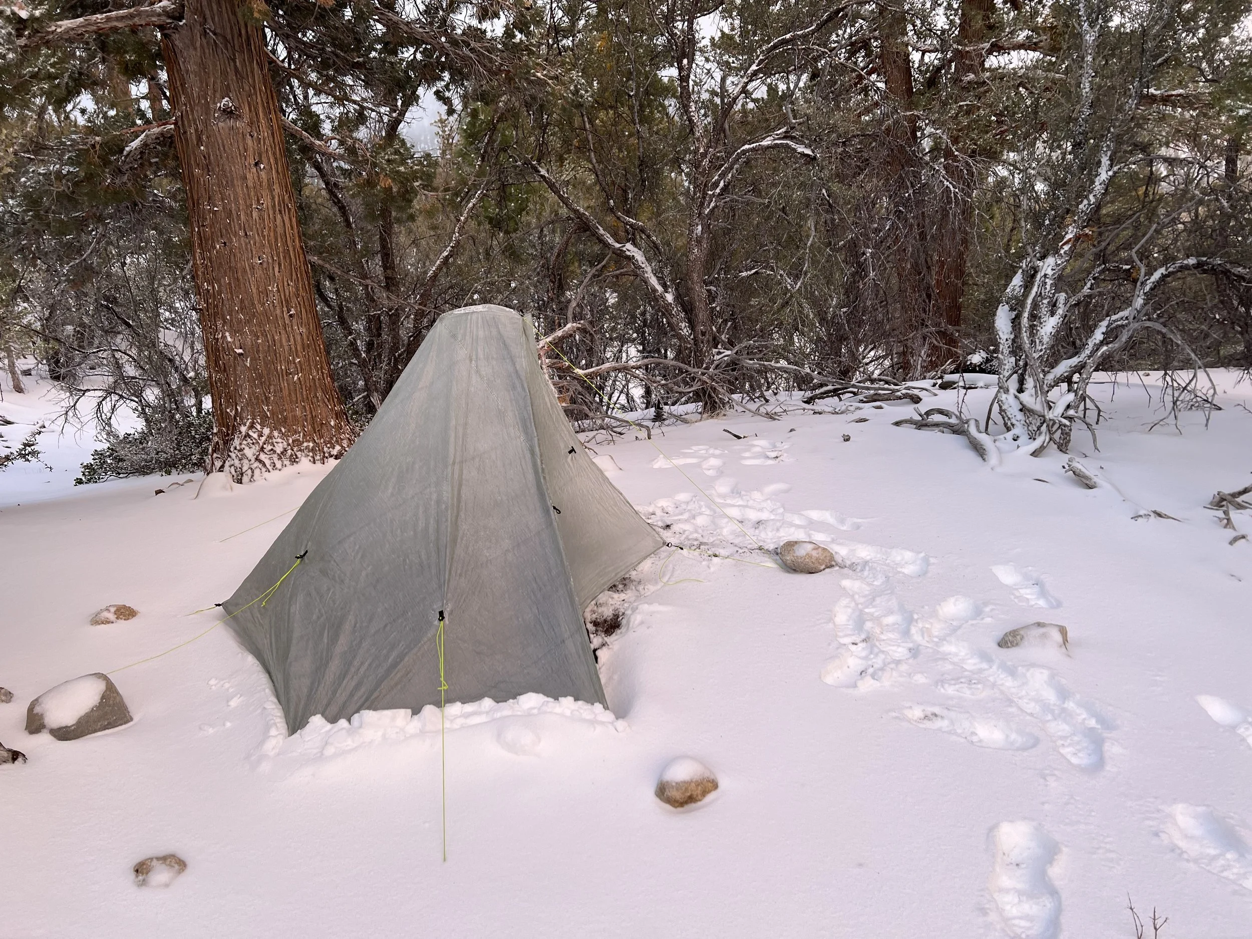 I could feel the temperature drop as I made camp in a well protected spot and settled in for the night with my water filter in my sleeping bag so it wouldn’t freeze and be ruined. The wind blew (again) and the snow fell overnight. My tent again performed amazingly well - single walled and weighing only 600g it seemed capable of handling anything the elements threw at it.