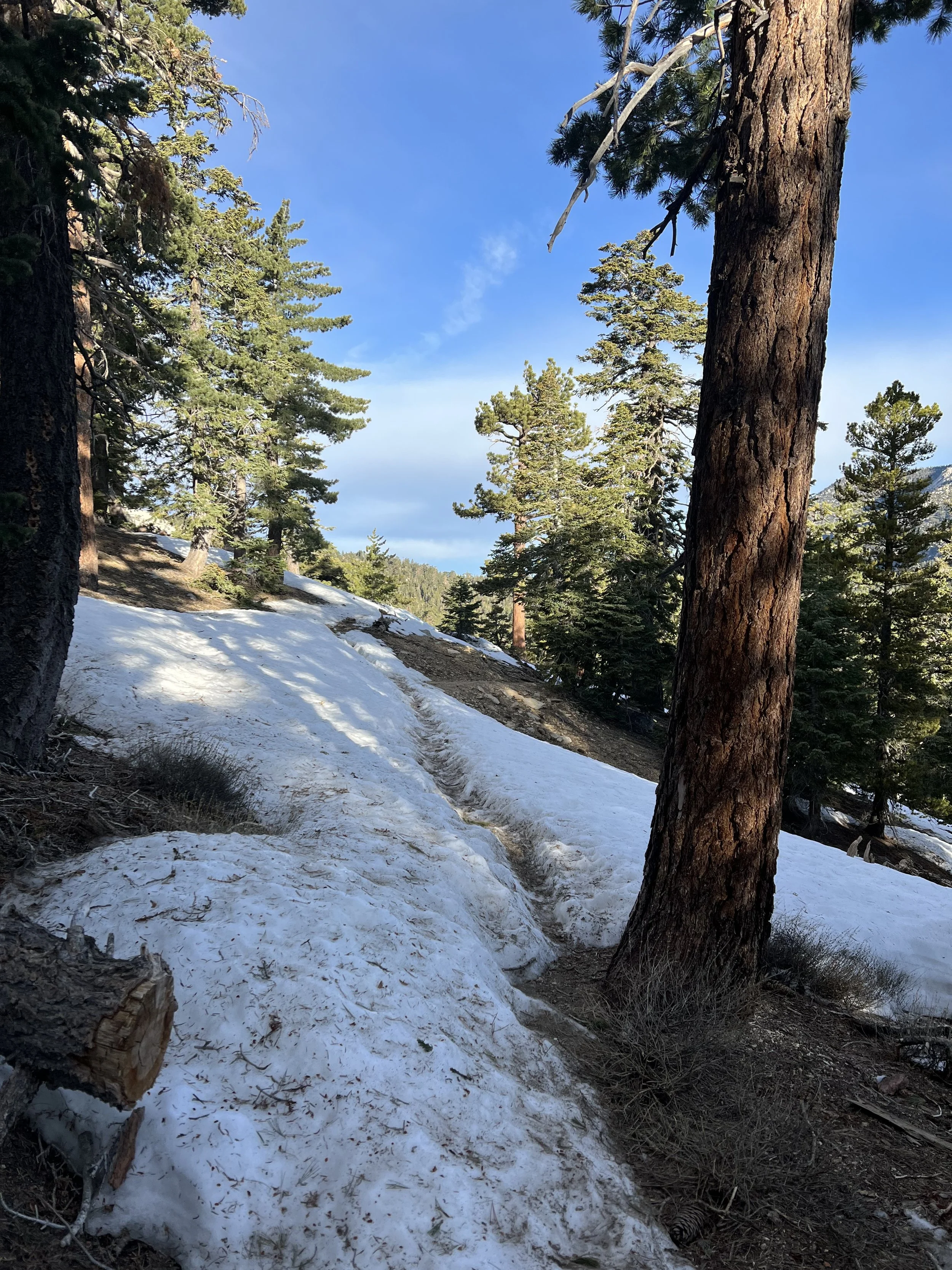 Having climbed over 7000’ and covered 25 miles I was looking forward to sleeping however the wind continued to pick up and noise from the trees and the buffeting of my tent meant I had little rest and arose early. I quickly packed up and chatting to others camped in the area I realized my tent was one of the few to weather the storm. Continuing the climb to Mount San Jacinto involved more blow downs (trees blown down blocking the trail) and travel over patches of snow - fairly easy given it was old well traveled snow but I did use micro spikes for part of the descent more out of caution than necessity.