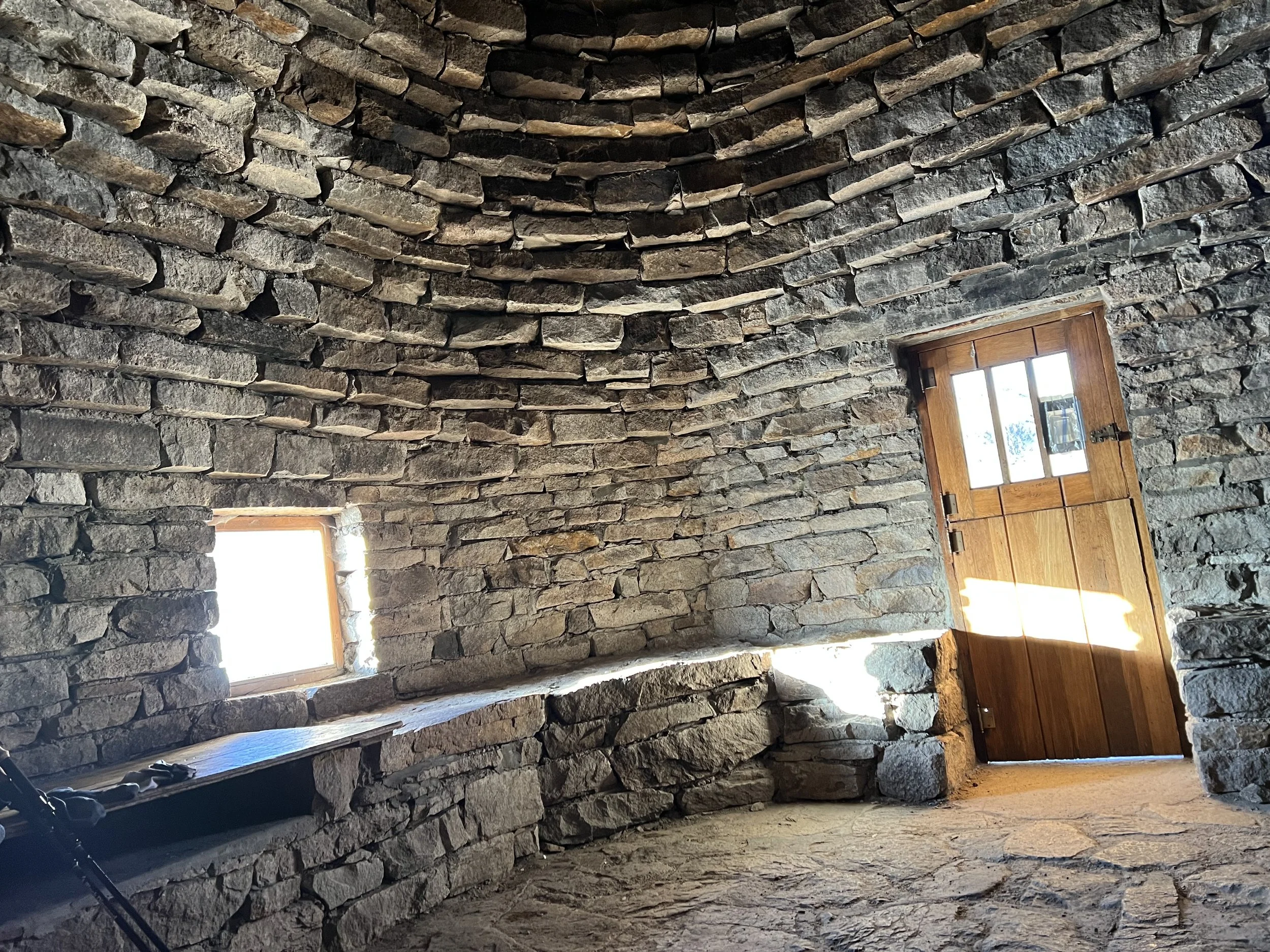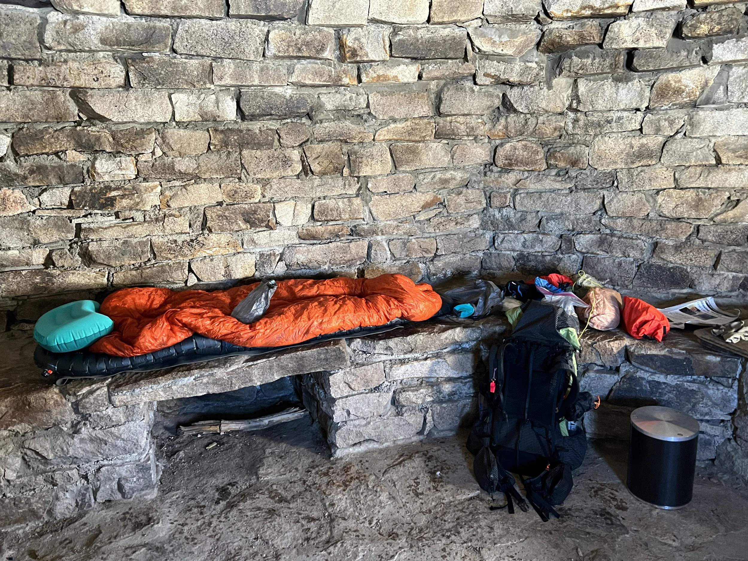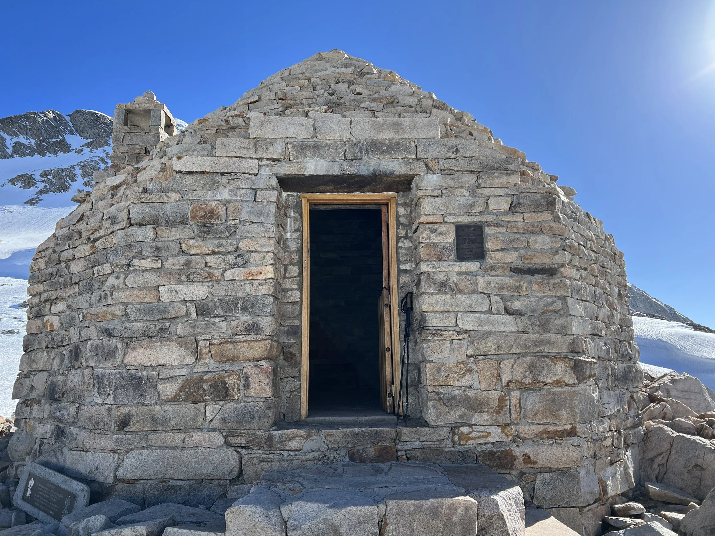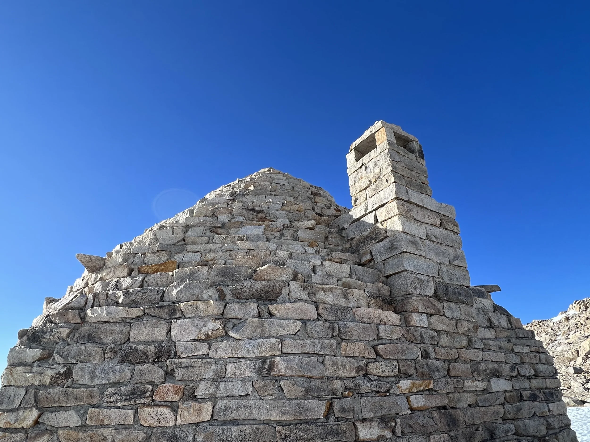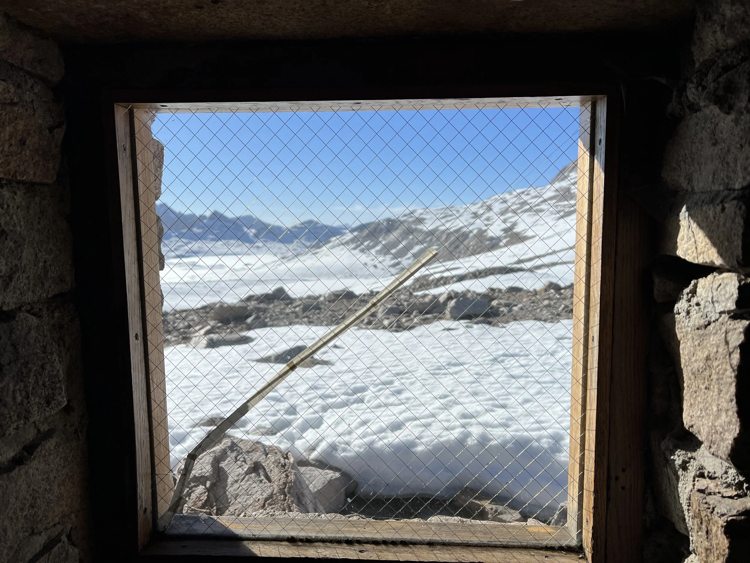 I reached the pass around 5.30pm, soaking wet and exhausted but with enough time descent the 4-5 miles to camp before darkness below the snow. However at the top of Muir Pass there is a shelter built in the 1930s. I’d been there the prior year and my recollection was it was for emergency use only - but there were no signs apart from saying it was a shelter for hikers. The setting is spectacular and the shelter an igloo like hut build of stone blocks, a small window gives a spectacular view and a stone bench runs around the inside of the round stone building. Nobody else had been mad enough to travel over those miles of softening snow in the late afternoon so I was alone. I decided to spend the night in one of the most spectacular places and structures I’ve been to.
