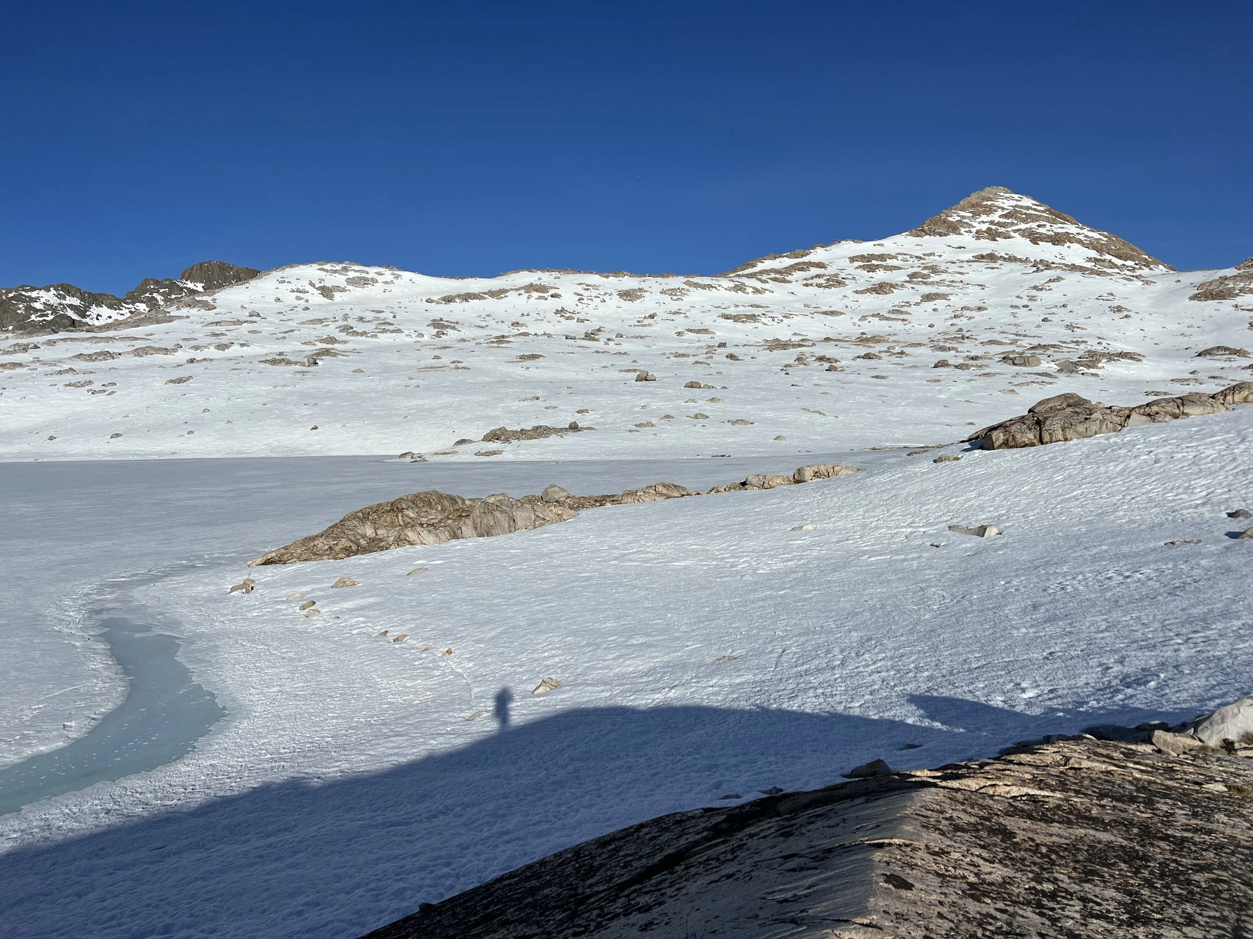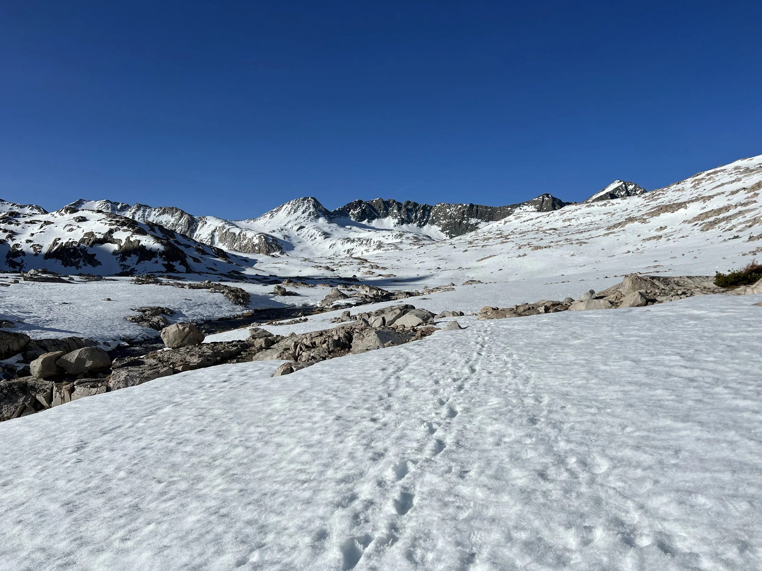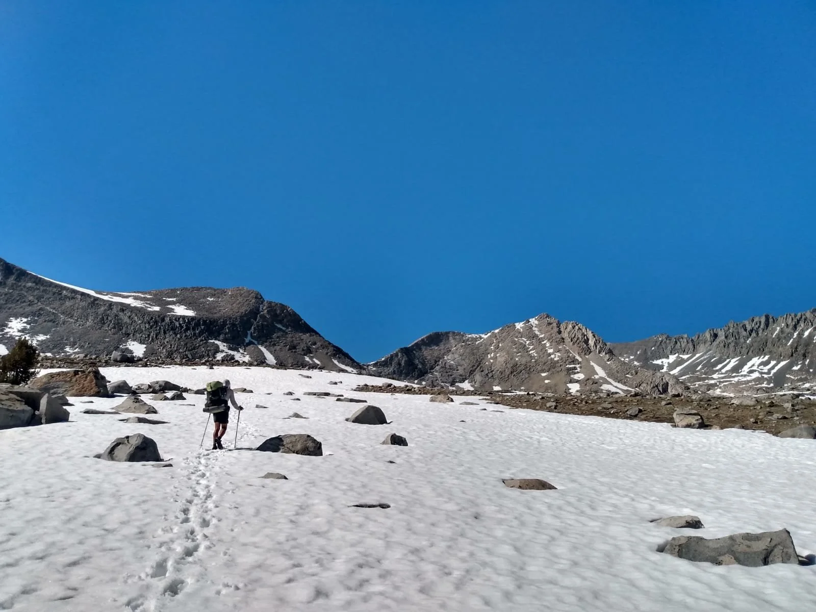 There were snow fields approaching the pass but easy to navigate, the switchbacks up and over the pass were snow free and I thought I was in for a fairly easy day however as soon as I reached the high point it was clear that while the southern aspect had been snow free the northern aspect had well over a mile of snow to navigate with frozen lakes and some fairly steep descents.