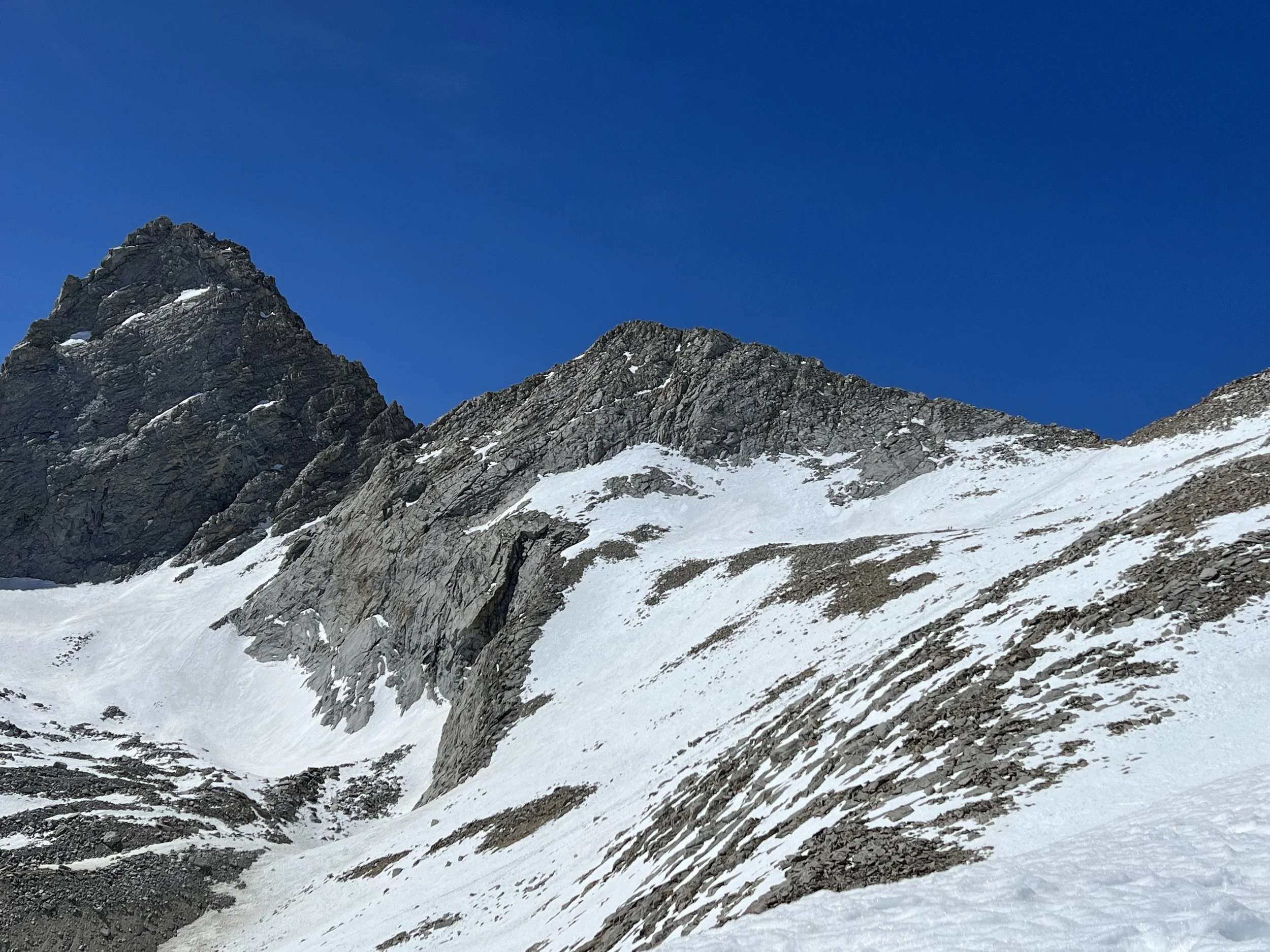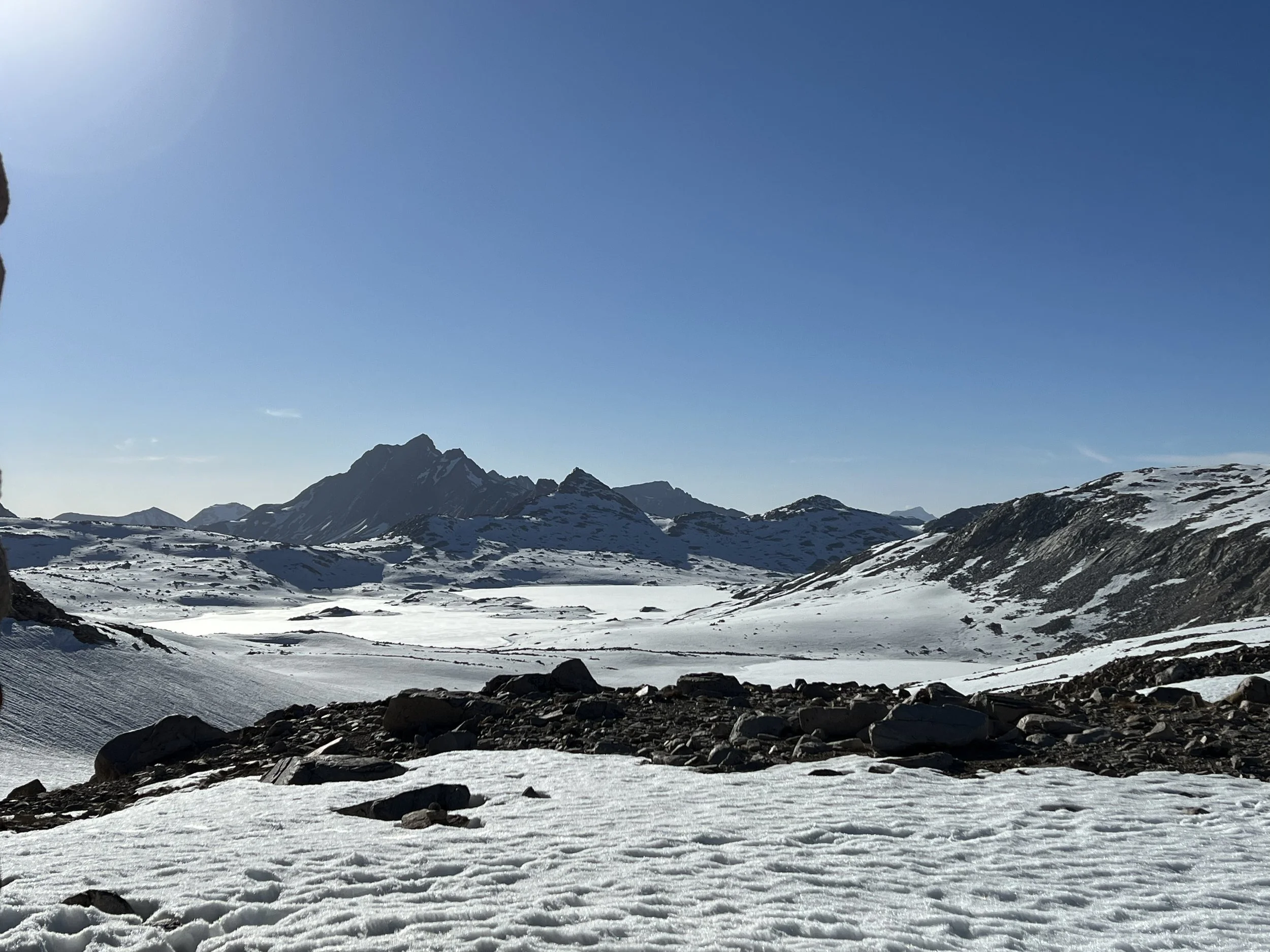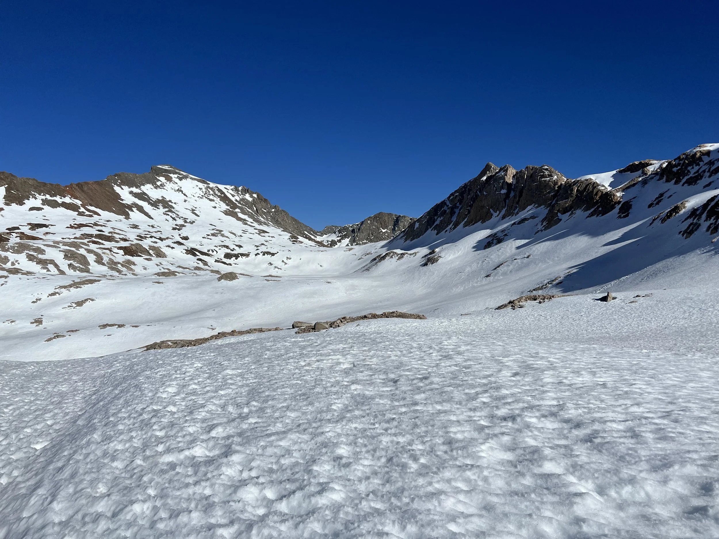 There were snow fields approaching the pass but easy to navigate, the switchbacks up and over the pass were snow free and I thought I was in for a fairly easy day however as soon as I reached the high point it was clear that while the southern aspect had been snow free the northern aspect had well over a mile of snow to navigate with frozen lakes and some fairly steep descents.