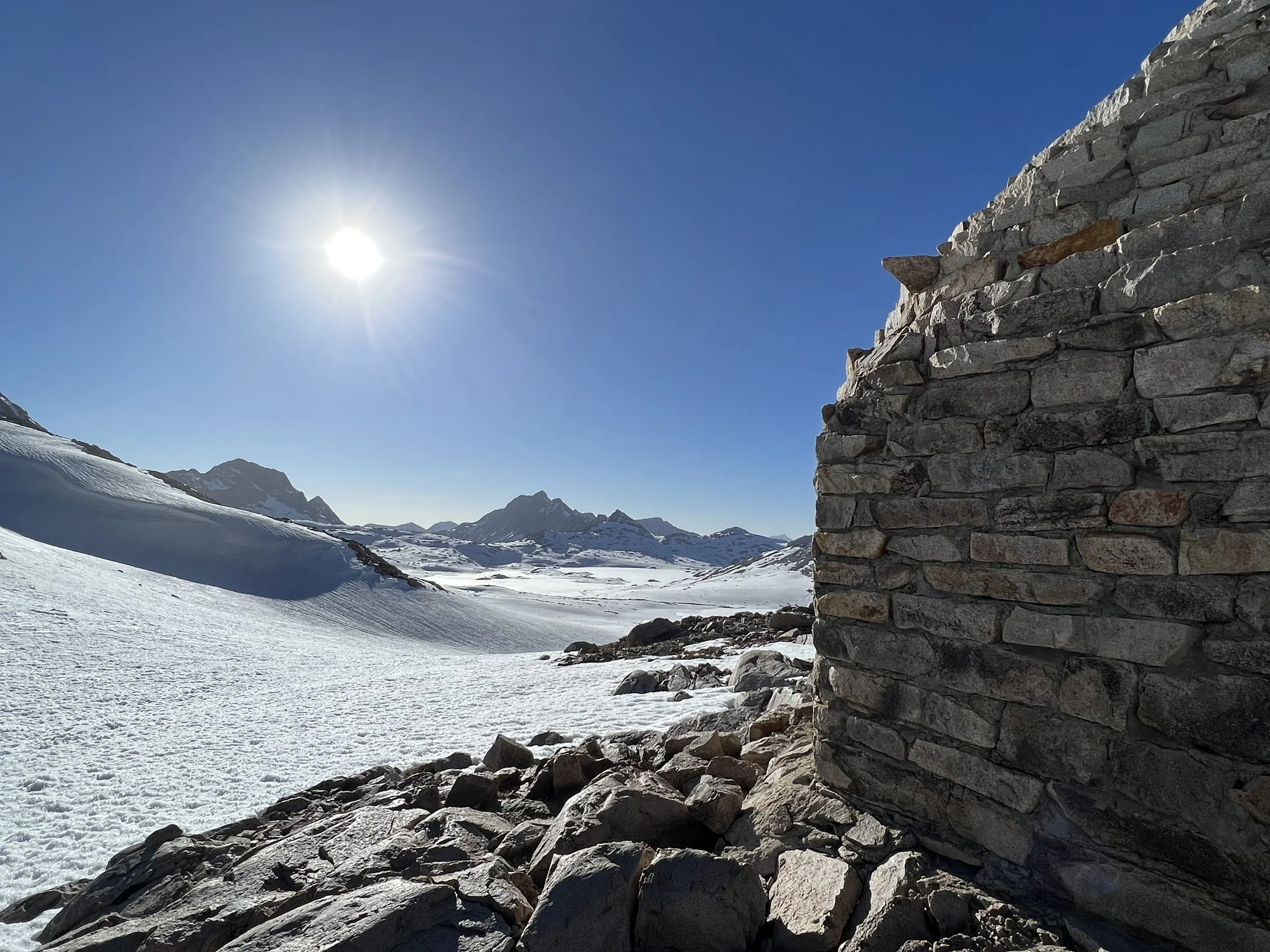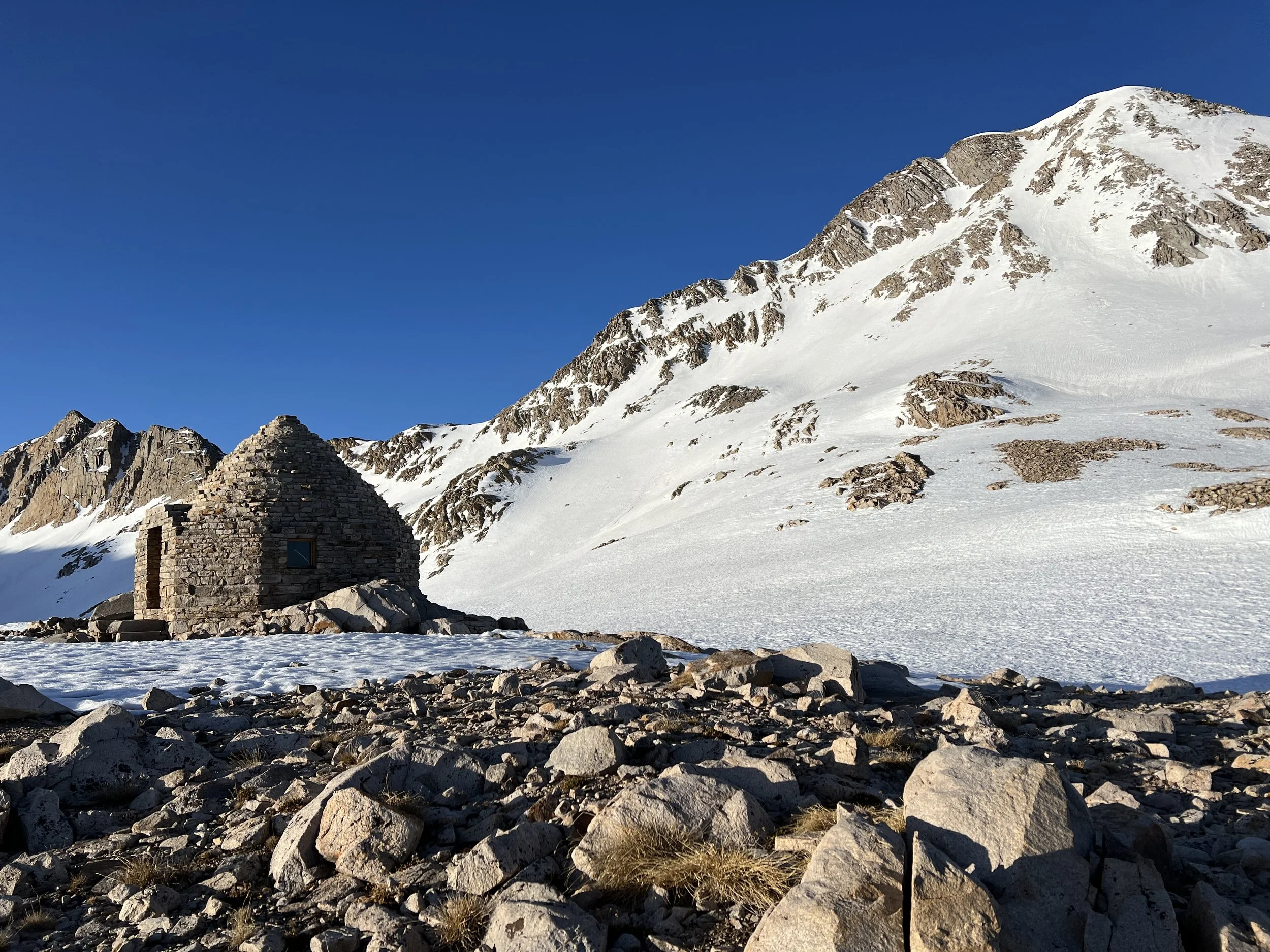 The stone building retained the previous day’s heat of the sun well and I awoke well rested, warm and all my gear, including my shoes, had dried out. Leaving early morning the snow was still firm for the descent and I was able to travel quickly and easily over the 4 or 5 miles of snow below the shelter.