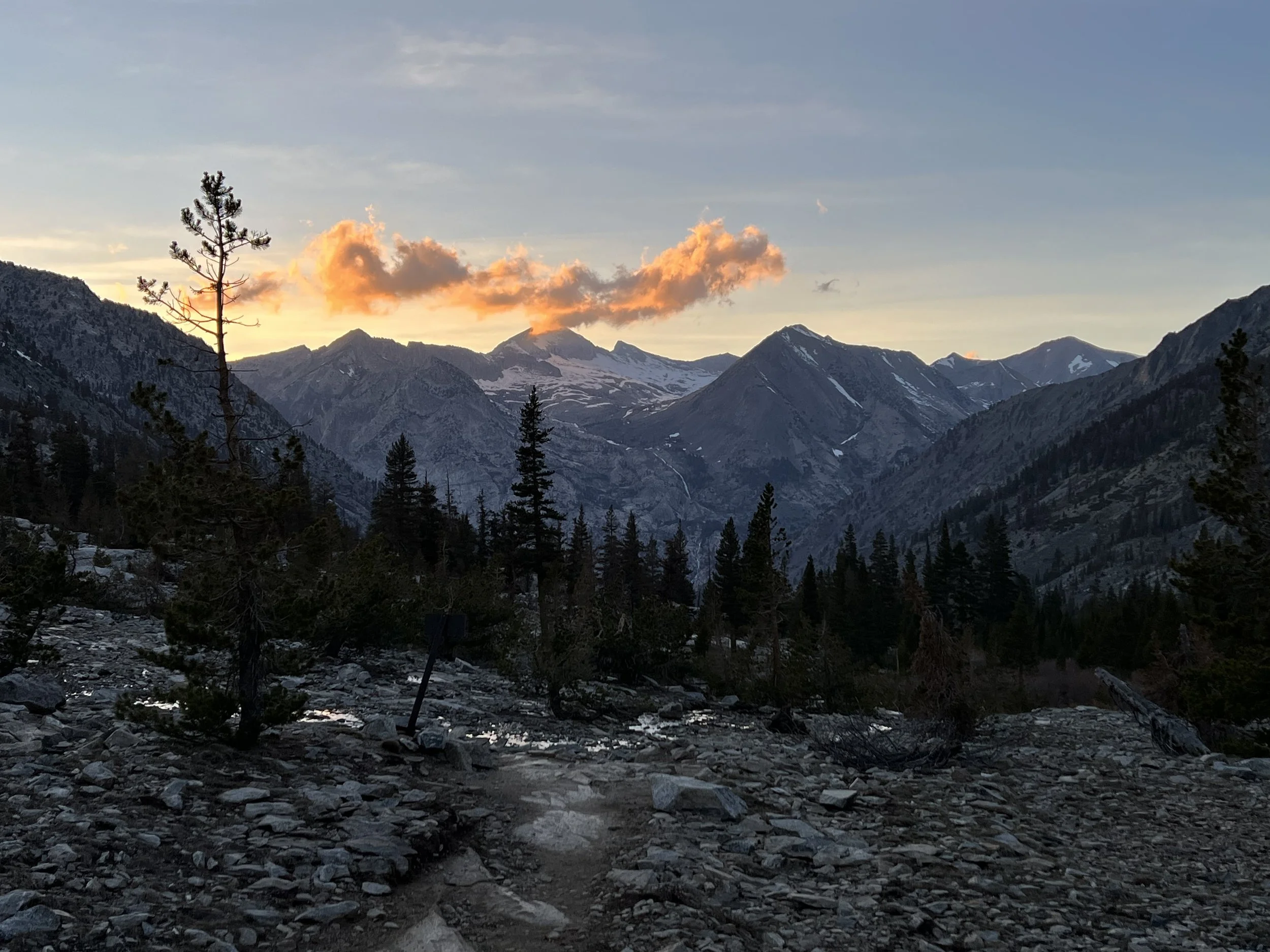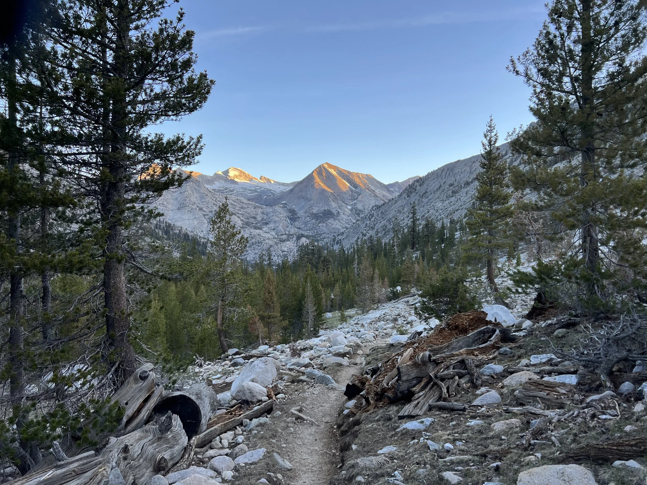 I knew the next day was going to be challenging with around 24 miles required to cover both Pichot Pass and Mather Pass. Both were around 12,000’ and there had been reports that the ascent up Mather Pass was somewhat technical with steep switchbacks over snow. I made an early start and delighted in the morning sun as it appeared over the mountains as I descended Glen Pass towards Pichot Pass.
